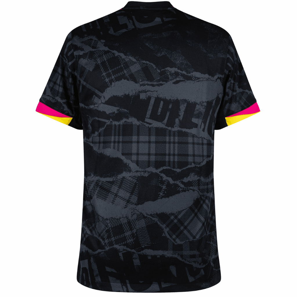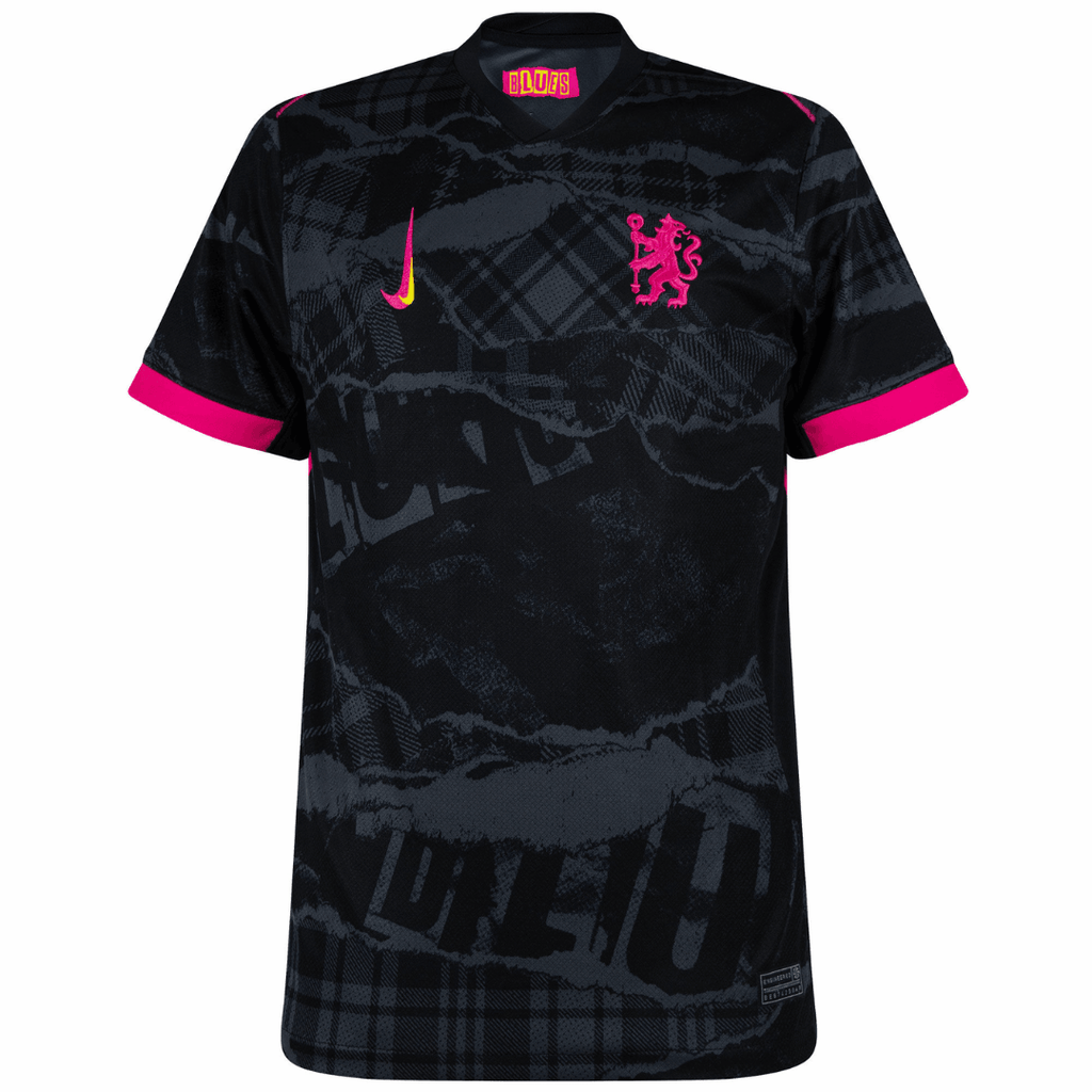 Chelsea third 24/25 Black. Pink OLYMPIC STORE apresenta-se como uma camisola moderna e arrojada, pensada para adeptos que valorizam estilo, identidade e ligação ao futebol de alto nível. Este equipamento alternativo destaca-se pela combinação de cores preta e rosa, criando um visual marcante que reflete inovação e atitude dentro e fora de campo.